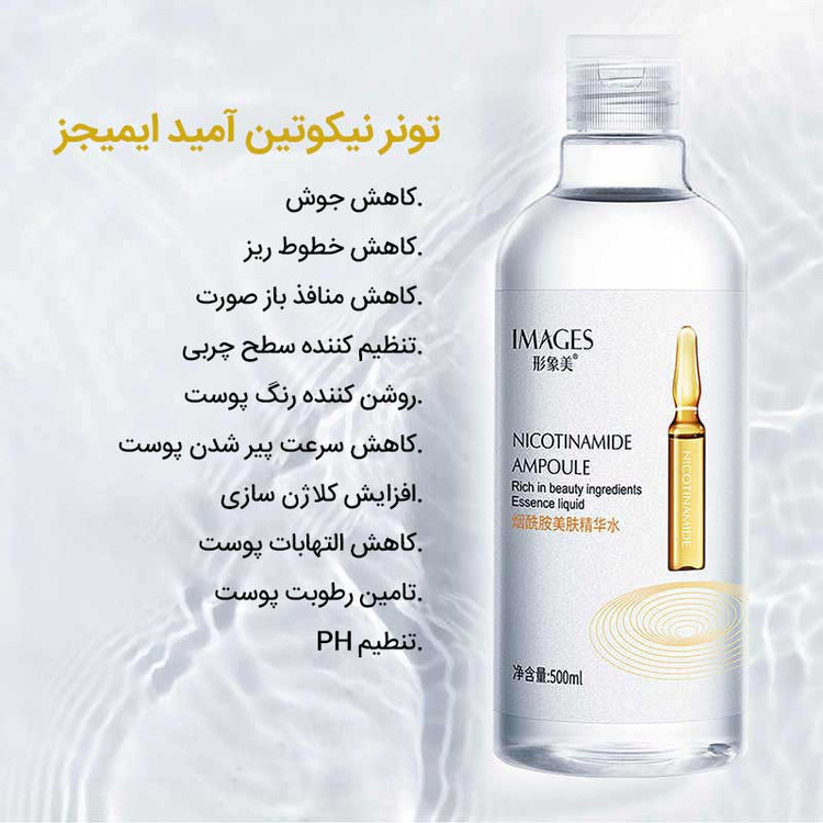 تونر نیکوتینآمید اسید 500 میل ایمیجز IMAGES ویژگی محصول: حجم ۵۰۰ میلی لیتر نیم کیلویی عالی برای پوست چرب و منافذ باز پوست مناسب انواع پوست مخصوصا پوست چرب کنترل کننده چربی اضافه پوست جلوگیری از ایجاد لک و کک و مک متعادل کننده و کنترل PH پوست جوان سازی و لیفت کننده صورت پاکسازی عمقی منافذ آبرسان بسیار قوی